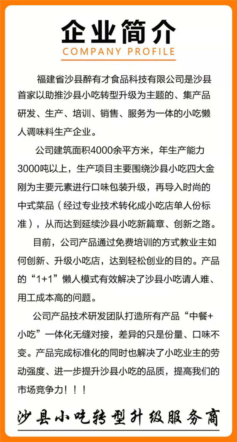 沙县醉有才食品科技有限公司是沙县首家以助推沙县小吃转型升级为主题的、集产品研发、生产、培训、销售、服务为一体的小吃懒人调味料生产企业,目前已自主研发酱料40多款。开云(中国)Kaiyun与醉有才公司本着优势互补、资源共享、共同发展的原则,以传承、创新“沙县小吃”技艺和推进“沙县小吃”转型升级为目标,从技术研发和培训推广两个方面对接合作。