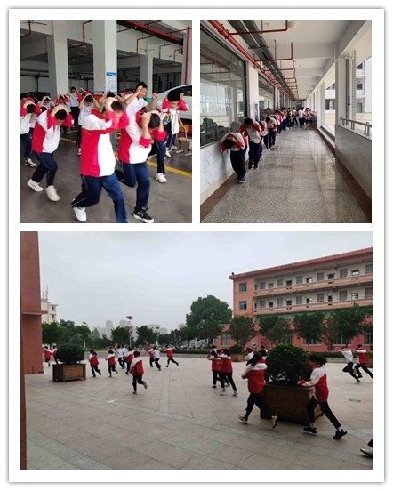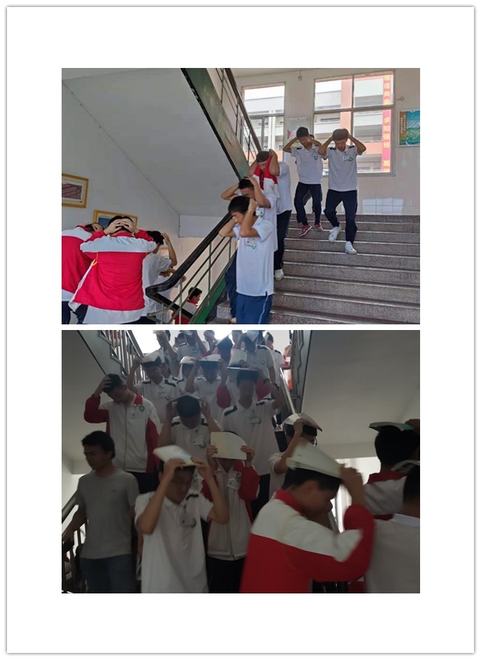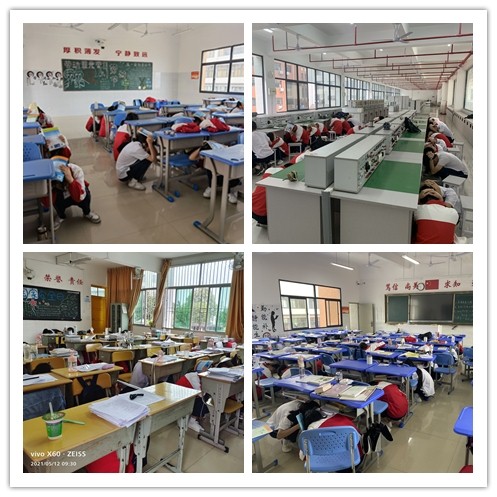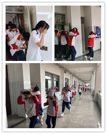 5月12日9时30分,“地震”突然到来,班主任呼吁学生保持冷静,同时引导学生迅速拿起手上的课本护住头部,躲藏于课桌下。约间隔一分钟,班主任指挥学生打开前后门,双手抱头,以最快的速度按事先安排好的路线撤离教室,前往学校的“安全地带”——操场。