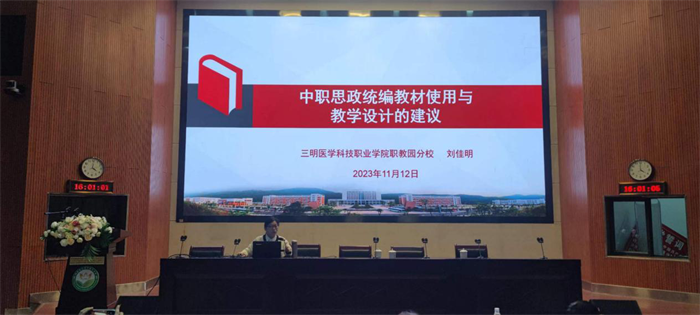 开班仪式后,三明医学科技职业学院刘佳明老师开设了主题为《学科核心素养导向下中职思政统编教材使用与教学设计的建议》的讲座,刘老师从教材的编写依据与思路、教材使用原则与各栏目的使用建议、教学设计的建议等三个方面对新教材剖析,并分享经验。